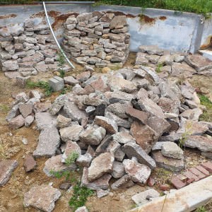 - הבריכה לאחר מילוי הדפנות בסלעים ולבנים