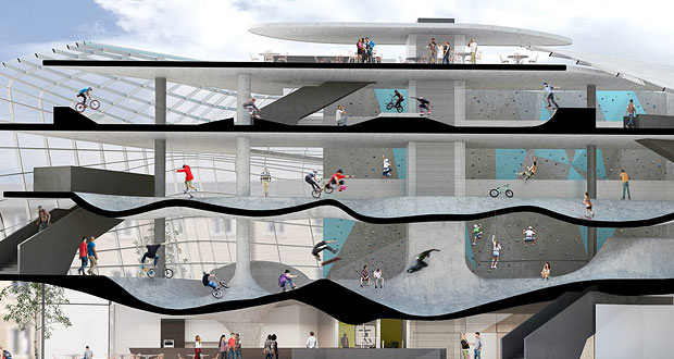 הסקייטפארק המתוכנן, מבט לכל הקומות. קרדיט: Guy Hollaway Architects